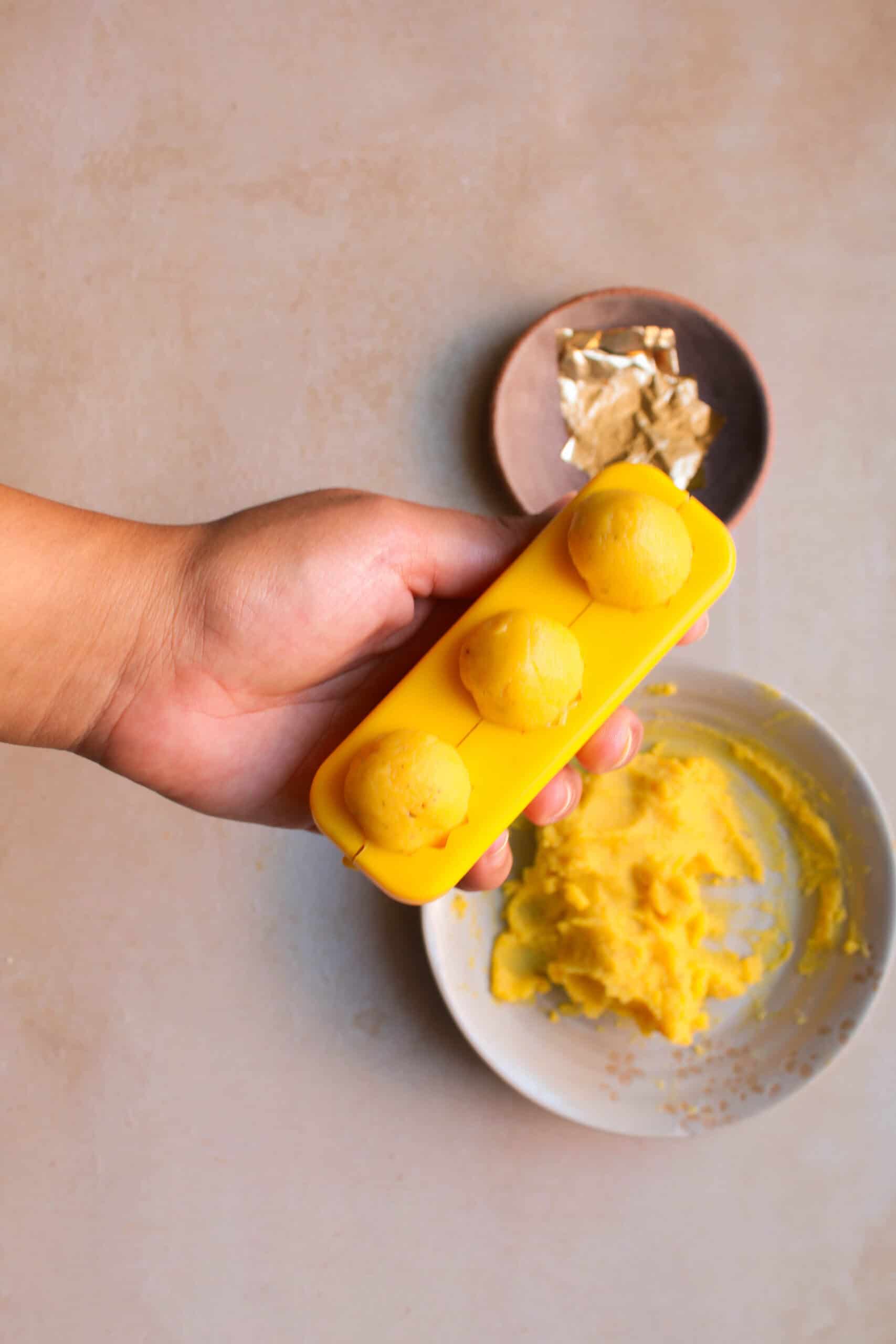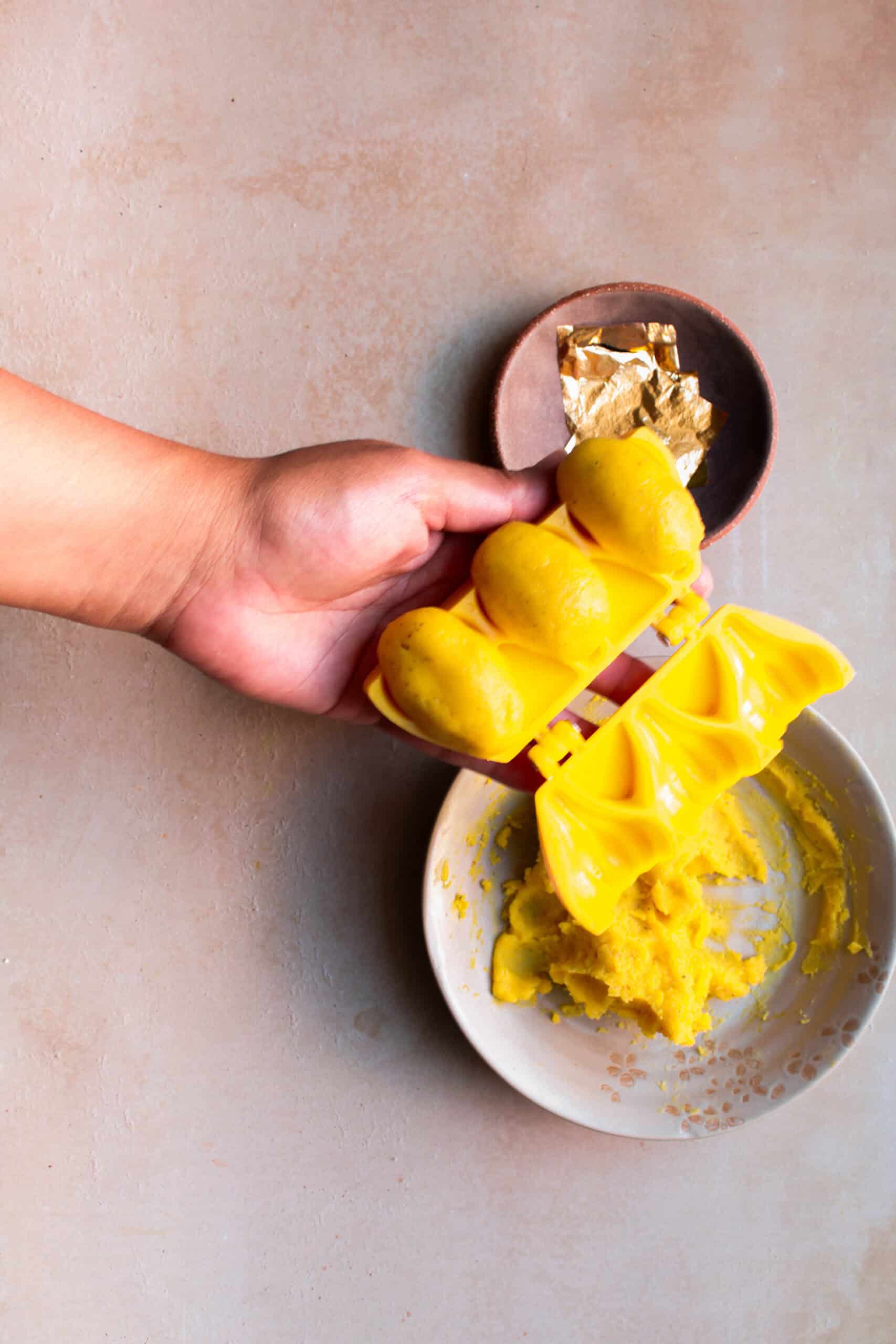- Apply ghee to moulds and hands for smooth shaping.