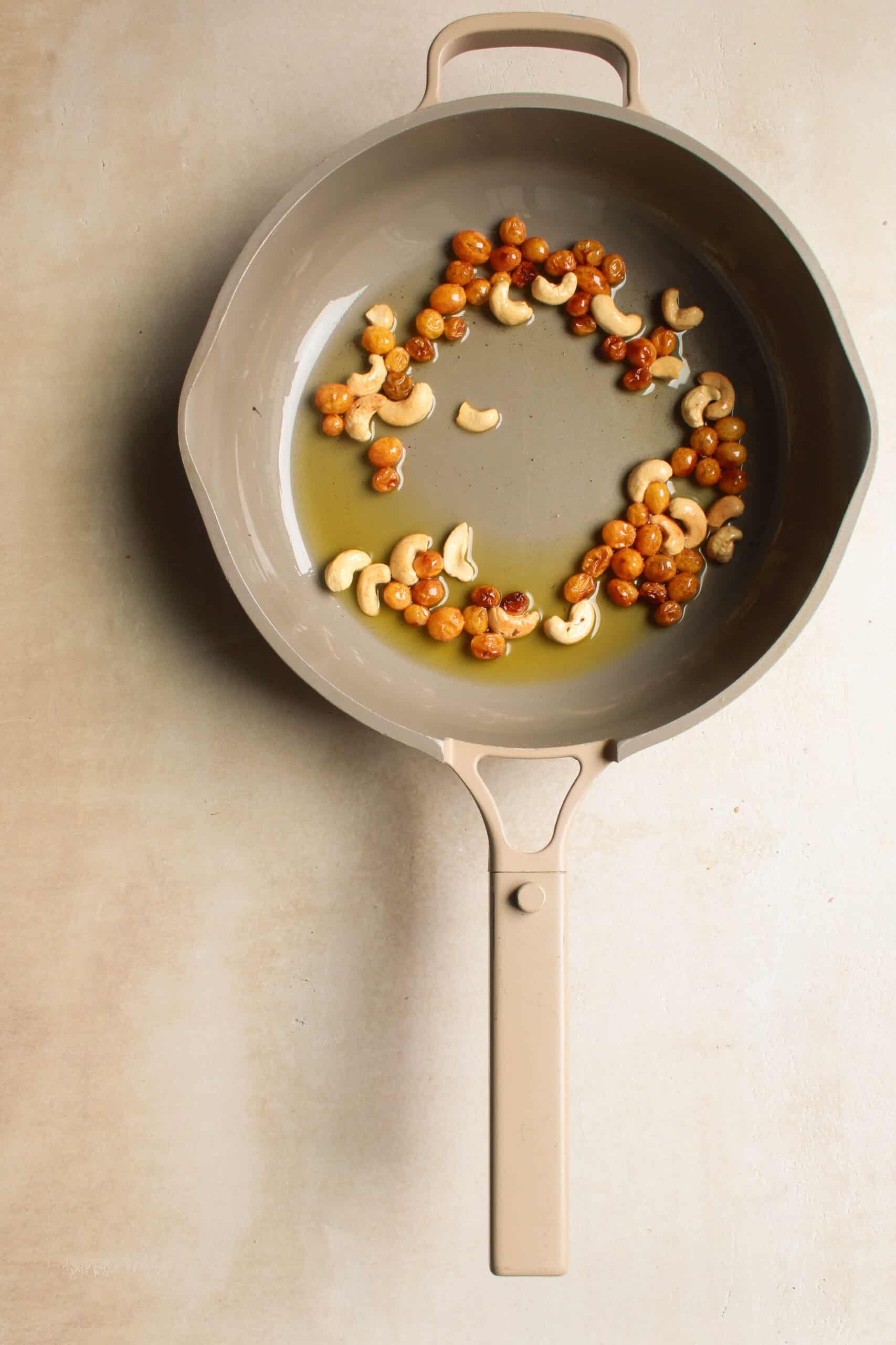 - Add cashews, and raisins. Toast until the nuts turn golden and the raisins plump up. Remove and set aside.