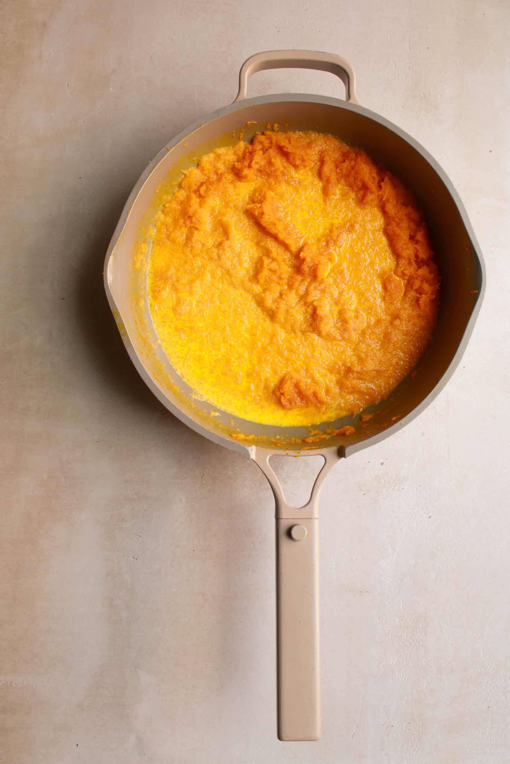 - In the same pan, add 2 tablespoons of ghee and the grated pumpkin.